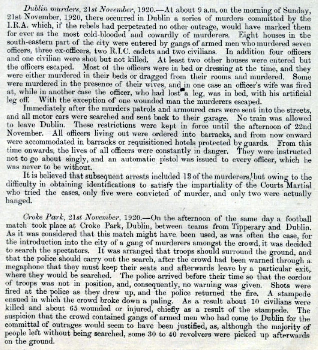 It was not until I went back to the military hospital on the afternoon of 21st November that I realised that our house had not been the only one visited by the murderers. The matron there told me that the dead bodies of fourteen British officers lay in the hospital mortuary. Nine of these were in pyjamas. That little sentence shows in what circumstances the majority of them lost their lives. Two officers who had dined at our house on the Saturday night were among the killed. These officers were Roman Catholics, and, I was told, had taken up special service work from a sense of duty. Tale after tale of horror was unfolded to me until my brain reeled,and I felt I could bear no more.