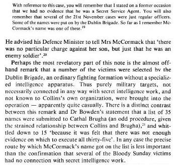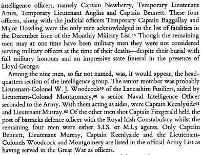 As Townshend says, the evidence from Collins himself is that "the list" for the 21st November was not his alone, and had been augmented by the local IRA without perhaps the same evidence against the men murdered, as Collins had amassed against the men on his original list. Basically we do not know who was on Collins original list - in other words we do not know who was added by local IRA commanders, and we do not know who was on Collins list and who escaped by being out when the IRA arrived.