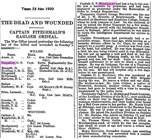 Fifteen men were killed as a result of the IRA Operation on 21 Nov 1920, 12 men died immediately when they were shot in their bedrooms, another ( Montgomery) died later, and 2 Auxiliaries who were part of the British response were later killed, make fifteen in all. Four more were wounded.